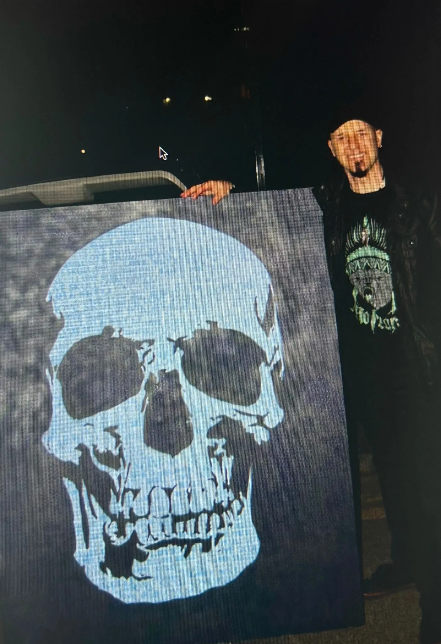 I love my Love Skull. It gazes down upon me each night as I sleep to remind me of the the veil of death, and I awaken to it to remind me of the joy of life that the day will bring.. thanks Gene for making me feel and appreciate this short life… Ace”